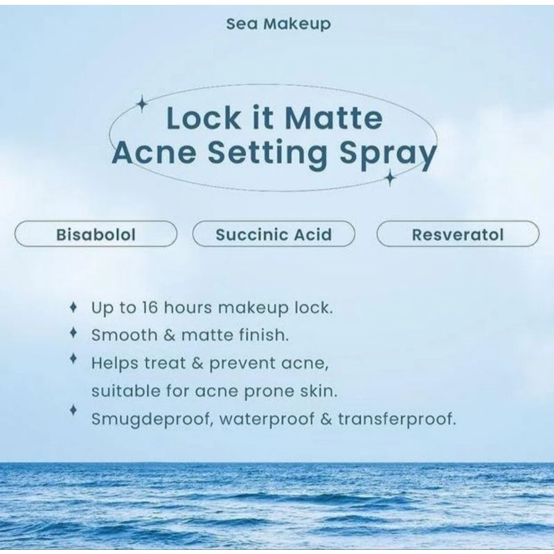 Setting spray yang dilengkapi oleh succinic acid, resveratrol dan bisabolol membuat SEA Makeup Lock it Matte Acne Setting Spray ini merupakan produk makeup yang diformulasikan khusus sebagai makeup yang memiliki fungsi untuk menyembuhkan dan merawat kulit jerawat. Setting dan finishing spray yang menjaga riasan tetap segar, dan tahan transfer hingga 16 jam. Dapat digunakan sebelum makeup juga untuk membantu makeup lebih menempel seharian.