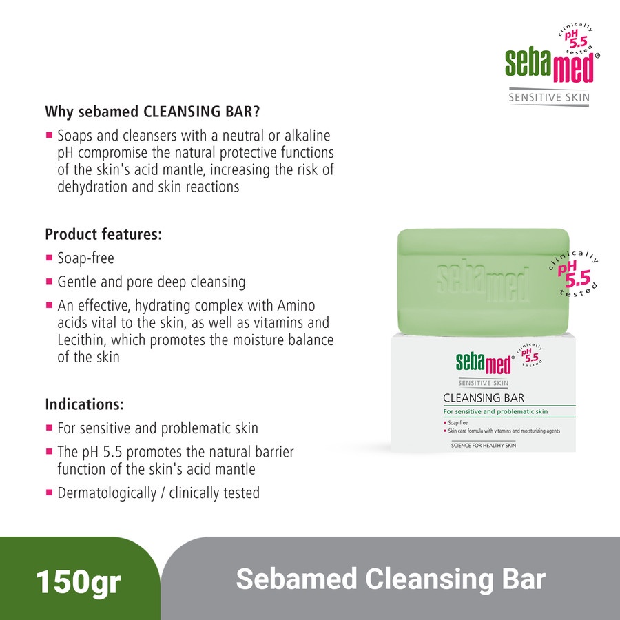 Sebamed Cleansing Bar - Membersihkan kulit tanpa sabun menggunakan formula paten Syndet pH 5.5 dari Jerman - Menjaga kulit dari kekeringan dan iritasi - Menggunakan mild cleansing agents dan bahan aktif yang memberikan perawatan pada kulit sensitif - Formula panthenol dan vitamin E meregenerasi, melembutkan dan memelihara kulit - Tidak menyebabkan alergi selama sedang menjalani terapi pengobatan penyakit kulit (Hypoallergenic)