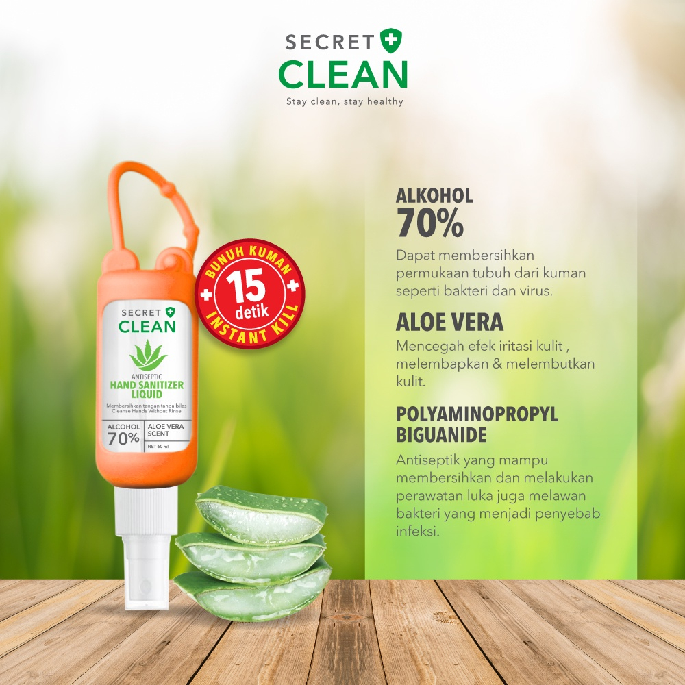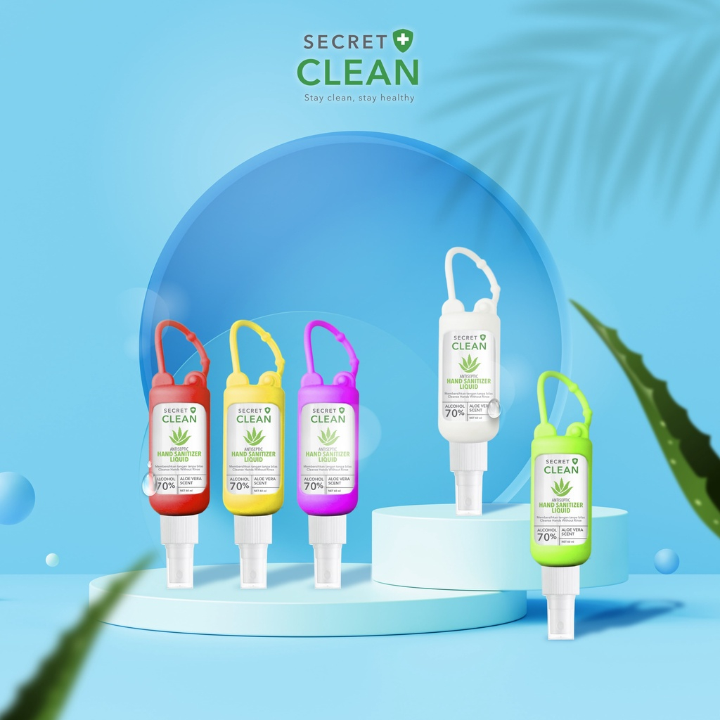 Untuk itu, kamu butuh Secret Clean Hand Sanitizer Liquid 60ml + Silicone Case. Hadir dalam kemasan spray, cairan pembersih tangan tanpa bilas ini mengandung keharuman alami ALOE VERA dan ALKOHOL 70%.