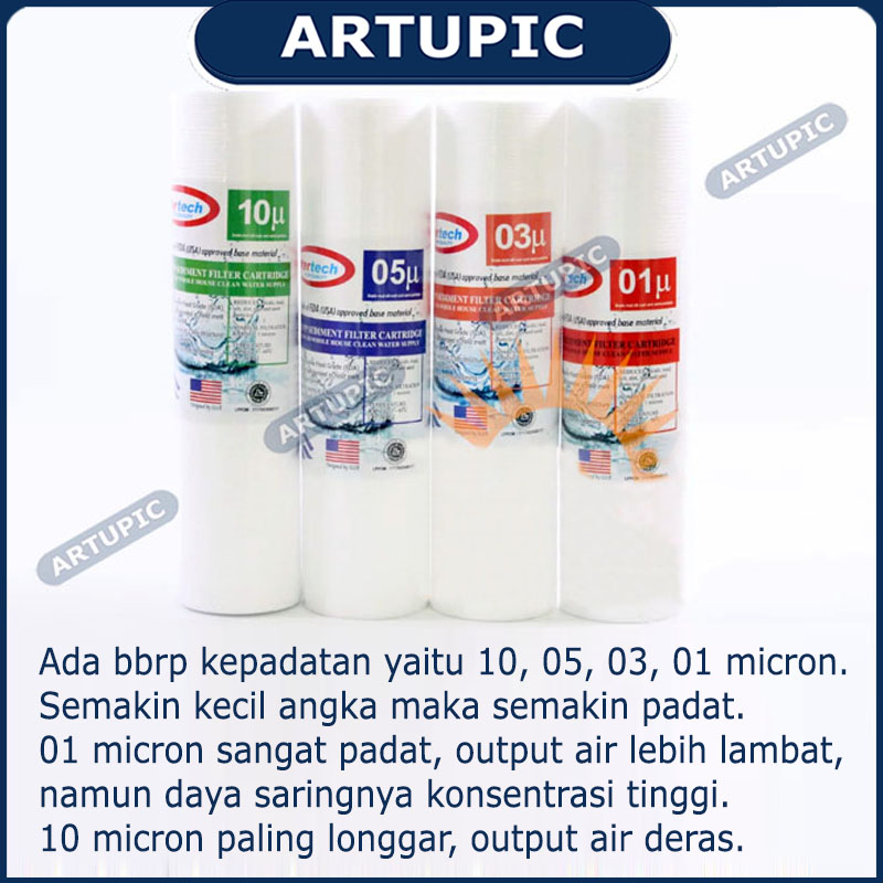 INFO = + 01 micron = Sangat padat, daya saring paling max. + 03 micron = Cukup padat. + 05 micron = Kepadatan menengah. Paling umum digunakan di rumah tangga. + 10 micron = Kepadatan rendah. Air sangat deras, cocok untuk menyaring air bersih. ________________________ BELI JUGA = + Housing Filter Air 10" Blue 3/4". + Filter Air 01 micron. + Filter Air 03 micron. + Filter Air 05 micron. + Filter Air 10 micron. + Filter CTO ANTI BACTERIAL. ________________________
