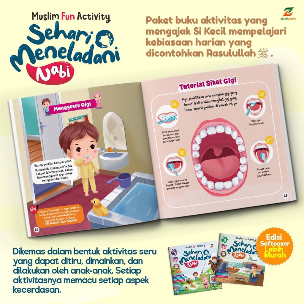 Untuk menumbuhkan kebiasaan baik yang berlandaskan Islam, Ayah Bunda bisa mengajarkannya melalui buku cerita yang berjudul “SEHARI MENELADANI NABI”. Ini adalah sepaket buku yang di dalamnya berisi kebiasaan sehari-hari Rasulullah semasa hidupnya. Mulai dari bangun tidur hingga memejamkan mata di malam hari.