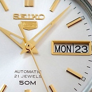 Brand Seiko Model SNK885K1 Series Seiko 5 Gender Woman Movement Automatic, 21 Jewels, Cal. 7S26 Case Diameter 35 mm without Crown Case Thickness 12 mm Band Stainless Steel Bracelet Clasp Fold Over Clasp with Push Button Case Stainless Steel Dial Color Silver with Gold Tone Hands & Markers Glass Hardlex Crystal Crown at 3 o'clock position Day date display at 3 O'clock position Water Resistant 50m Luminous Tone Hands & Markers