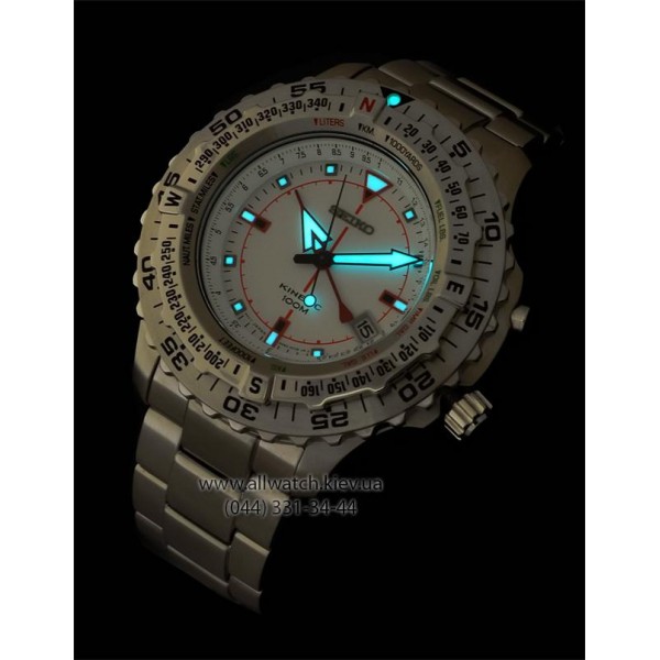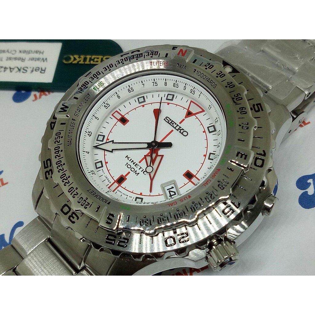 Brand Seiko Model SKA421P1 Movement Kinetic, Cal. 5M82 Glass Hardlex Diameter 48 mm without Crown Thickness 15 mm Lug Width 22 mm Case Stainless Steel Band Stainless Steel Clasp Fold Clasp with secure lock and push button release Dial Color White Bidirectional First Bezel Slide Rule for Pilot Unidirectional Second Bezel Luminous hands and markers Water resistant 100 meters Screw Down Case Back