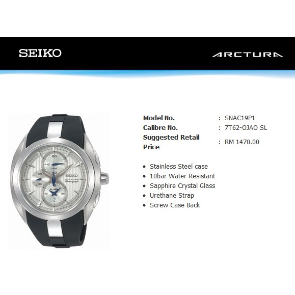 Brand Seiko Model Number #SNAC19P1 Series Seiko #Arctura Gender Man Movement #Japan #Quartz cal. 7T62 Glass Sapphire Crystal Glass Case Diameter 45 mm Case Thickness 10 mm Case Material #Stainless steel Band Material #Rubber (Black) Clasp Normal Tang Dial Color #Silver Special Features #Chronograph Function, Alarm Date, Month and 24 Hours Display Water pressure resistance 10 Bar #Waterresistant depth 100M #Original #Seiko include Box, Manual and Warranty Card for 1 Year