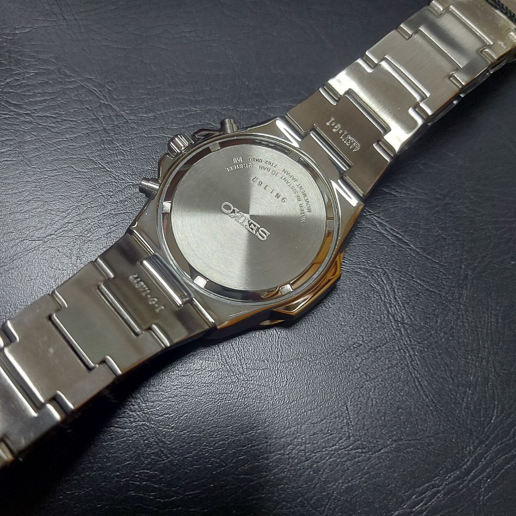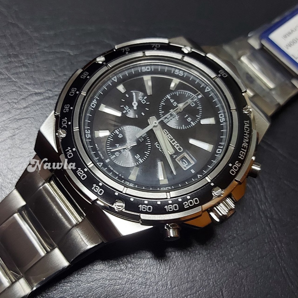Brand Seiko Model SNAD83P1 Movement Japan Quartz, 7T62 Glass Hardlex Dial Color Black Case Diameter 44 mm w/o crown Case Thickness 12 mm Lug Width 22 mm Case Stainless Steel Band Stainless Steel Clasp Three Fold Clasp with Push Button Release Date Display Luminous Chronograph Tachymeter on Bezel Alarm Water Resistant 10 BAR