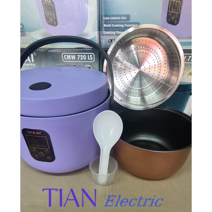 Sekai CMW720LS – Magic Com 1 Liter Low Sugar adalah Digital Rice Cooker Low Sugar Low Carbo, Penanak dan Penghangat Nasi dengan stainless body yang sangat cocok untuk keluarga anda. Dengan watt yang rendah sehingga bisa dioperasikan untuk semua kalangan. 3D Heating Element. Dengan tekhnologi 3D Heating Element membuat makanan tidak mudah basi dan bisa tahan hingga 48 Jam. Low Sugar Low Carbo. Menurunkan kadar gula pada beras, sehingga membuat nasi menjadi lebih sehat dan anti gemuk Material Anti Lengket.