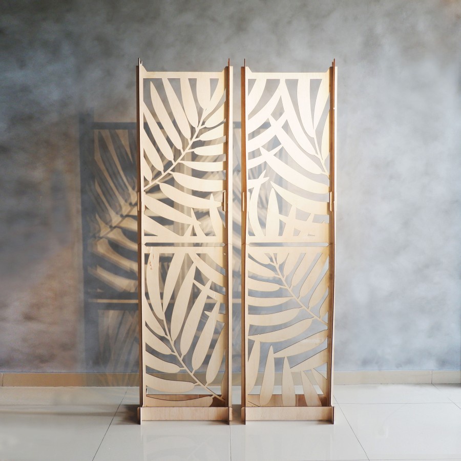 Sketsel atau pembatas ruangan berfungsi untuk membatasi ruang menjadi beberapa bagian dari area pandang. Sketsel dapat digunakan untuk ruang tamu, ruang kerja, sudut rumah, mushola dan lainnya. Sketsel Tropical Palm Leaf selain multifungsi juga dedesign minimalis aesthetic untuk menghiasi rumah kalian dan terbuat dari bahan kayu plywood sengon berkualitas serta diproduksi menggunakan mesin laser sehingga memberikan hasil yang maksimal