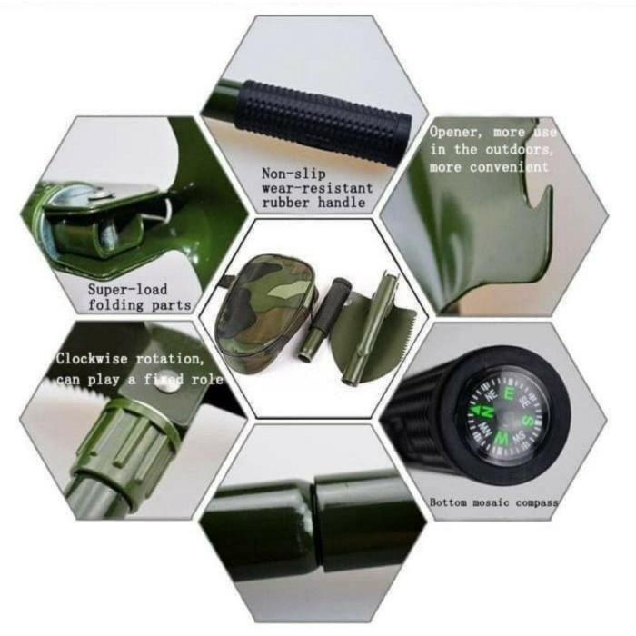 Cangkul lipat multifungsi hadir dengan fungsi yang beragam, dapat Anda gunakan sebagai pacul, skop, untuk keperluan kemping atau berkemah. Selain itu alat ini juga dapat digunakan sebagai pacul, sekop ataupun alat gali lainnya dengan banyak bentuk dan fungsinya, cocok untuk Anda gunakan saat camping.