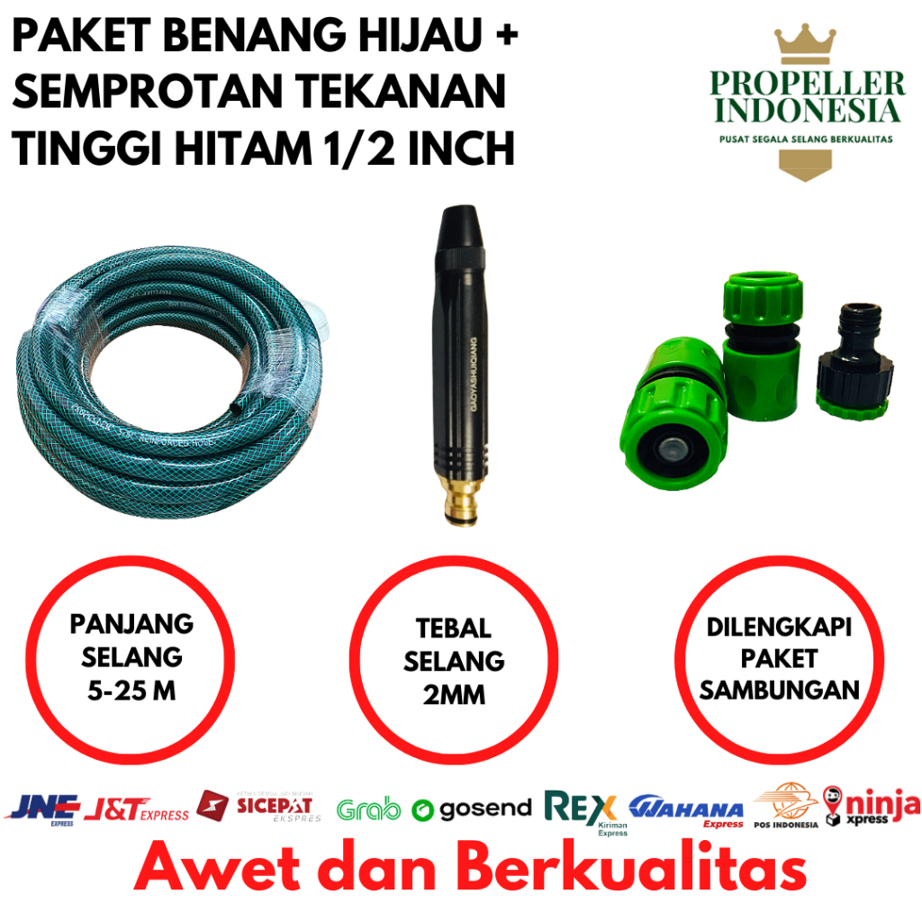 Detail Selang Air Benang 1/2 Inch Hijau Paket Semprotan Air Lurus Hitam