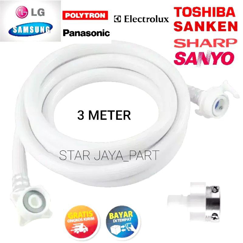 Selang mesin cuci ini dapat digunakan untuk semua tipe mesin cuci dari merek apapun: - Samsung - Electrolux - Panasonic - LG - Aqua / Sanyo - Denpoo - Sharp - Polytron - Sanken - Toshiba - Dan lain-lain