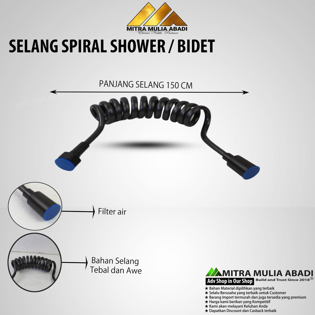 Selang Spiral Shower PVC Flexibel Spesifikasi : - Finishing coat / warna : Hitam- Bahan PVC - Panjang 150 CM - Panjang Selang 150 Cm Setelah Di tarik - Terbuat Dari Bahan PVC Lunak Flexibel - Kuat Dan Tahan Lama - Tidak Mudah Rusak Dan Bocor - Ramah Lingkungan
