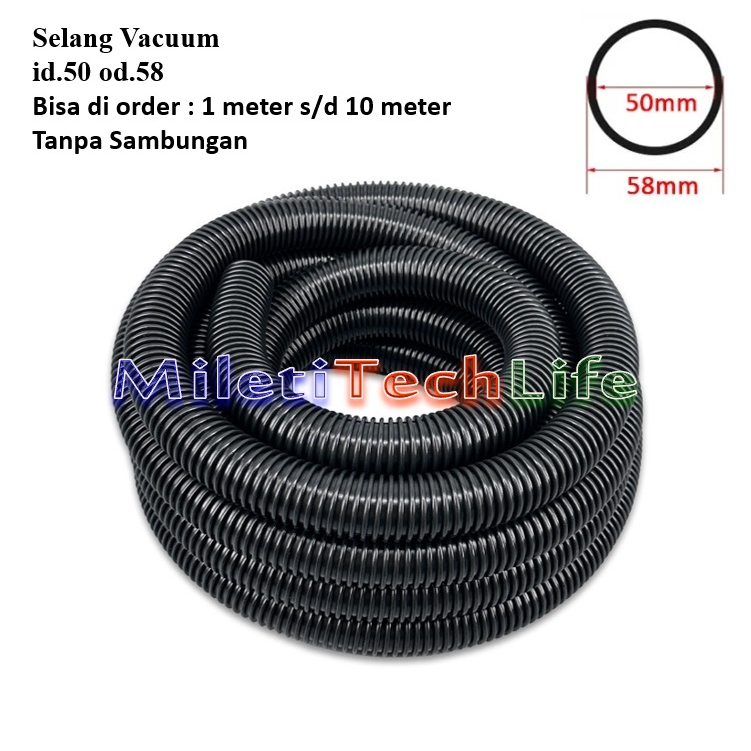 SPESIFIKASI Item : Selang Vacuum Only id.50 od.58 Inside Diameter : id. 50 mm Outside Diameter : od. 58 mm Panjang : 1 meter s/d 10meter Tanpa Sambungan Warna : Hitam Quantity : 1pcs (Harga Permeter)