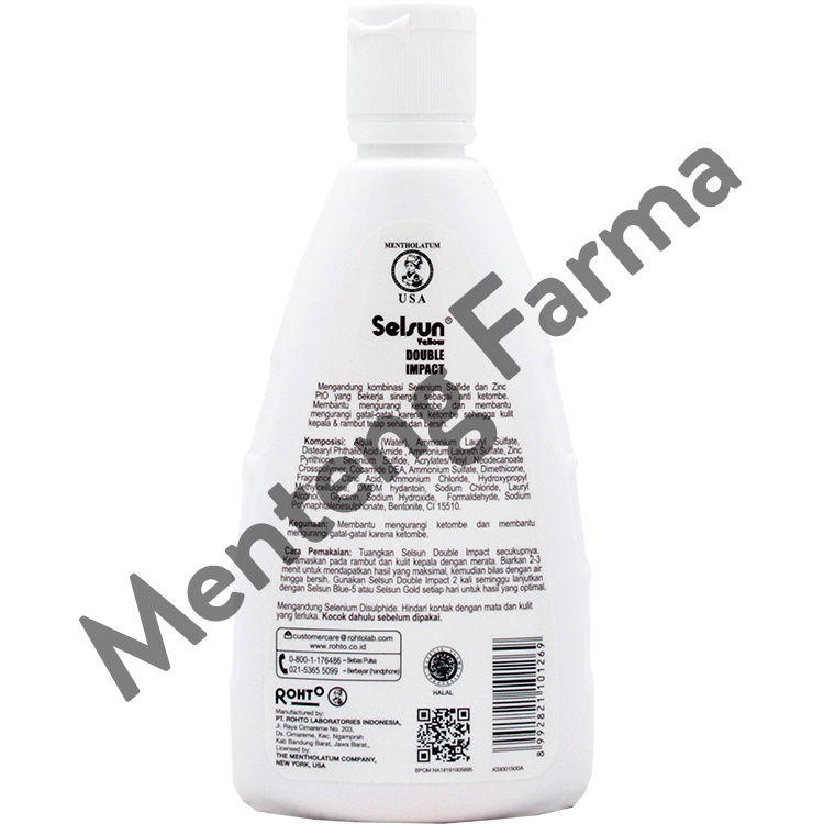 Selsun Yellow Double Impact Shampoo merupakan shampoo yang diformulasikan dengan dua kandungan anti ketombe sekaligus yaitu Selenium Sulfide 1% dan Zinc PtO 1% yang bekerja secara sinergis untuk menghambat pertumbuhan jamur penyebab ketombe sehingga kulit kepala tetap sehat dan bersih.