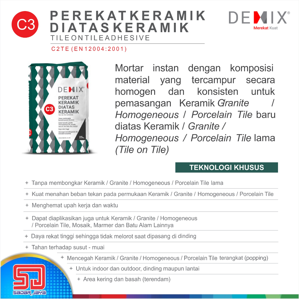 DEMIX C3 PEREKAT KERAMIK DIATAS KERAMIK Mortar untuk pemasangan keramik di atas keramik pada lantai dan dinding, terdiri dari campuran semen, pasir pilihan dan bahan aditif yang tercampur secara homogen dan konsisten, sehingga menghasilkan daya rekat yang tinggi, tanpa membongkar keramik/granite tile lama. Bisa diaplikasikan untuk pemasangan granite (homogeneous tile), mosaik, marmer dan batu alam lainnya, outdoor dan indoor.