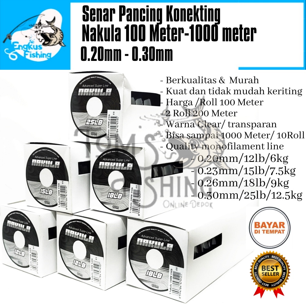 ● - Berkualitas & Murah ● - Kuat dan tidak mudah keriting ● - Harga /Roll 100 Meter ● - 2 Roll 200 Meter ● - Warna Clear/ transparan ● - Bisa sampai 1000 Meter/ 10Roll ● - Quality monofilament line ● - 0.20mm/12lb/6kg ● - 0.23mm/15lb/7.5kg ● - 0.26mm/18lb/9kg ● - 0.30mm/25lb/12.5kg