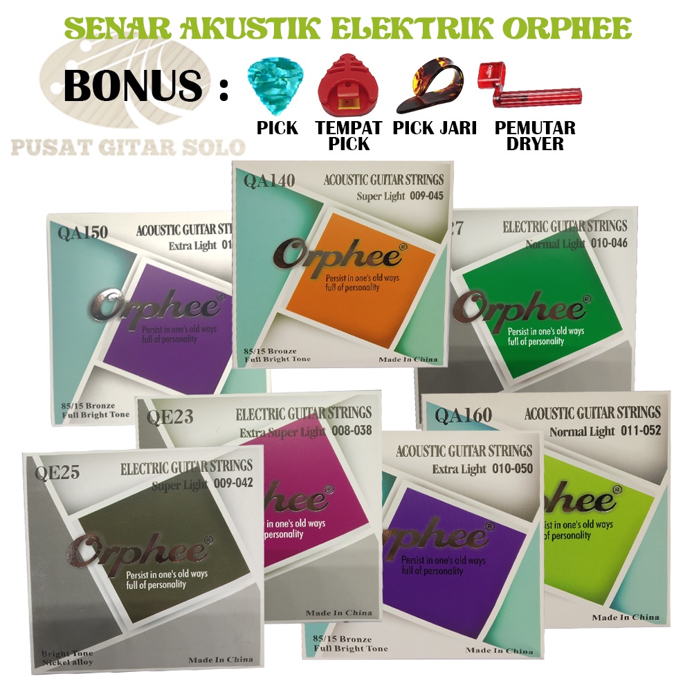 Selamat Datang di Toko Gitar Online Pusat Gitar Solo Pusat Gitar dan Aksesoris terlengkap, murah dan berkualitas. -------------------------------------- Kelebihan Belanja di Toko Kami : - Foto kami real picture dari hasil jepretan kamera kami. - Barang dijamin berkualitas dan bergaransi. - Produk hasil produksi sendiri. - Harga dijamin termurah. -------------------------------------- Senar Elektrik Import Kualitas OK Harga untuk 6 senar/1 set Merk Orphee Ready Stock -------------------------------------- BONUS PAKET : PAKET A : SENAR ORPHEE + PICK PAKET B : SENAR ORPHEE + PICK + PICK JARI + PEMUTAR DRYER + TEMPAT PICK