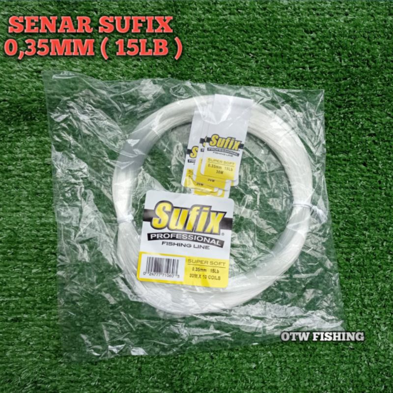 Senar pancing Sufix rangkaian / leader • warna = putih clear • ukuran = 0,35mm • kekuatan = 7,5kg / 15lb • Biasa dipakai untuk senar leader / rangkaian / untuk senar nelayan hand line • conecting / dipotong sesuai pesanan