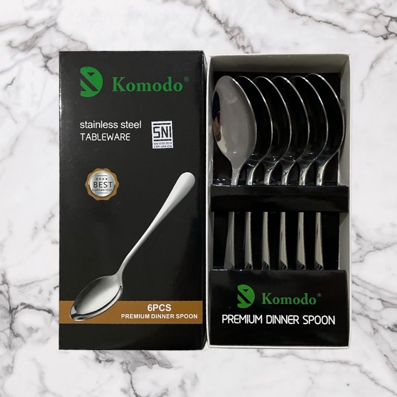 sendok merk komodo premium √ bahan sendok : stainless steel mengkilap √ tebal & awet dan cantik √ isi sendok 6pcs √ lebar sendok bagian mulut 4cm √ panjang sendok keseluruhan 19cm √ berat 1sendok 56 gram √ beras kesuluruhan 6 sendok dan kardus 400gram √ cocok untuk sajian tempat makan ruang tamu kantor hotel dll. √ sendok bagian gagang polos tidak ada motif sehingga menjadikan sendok berkelas elegan