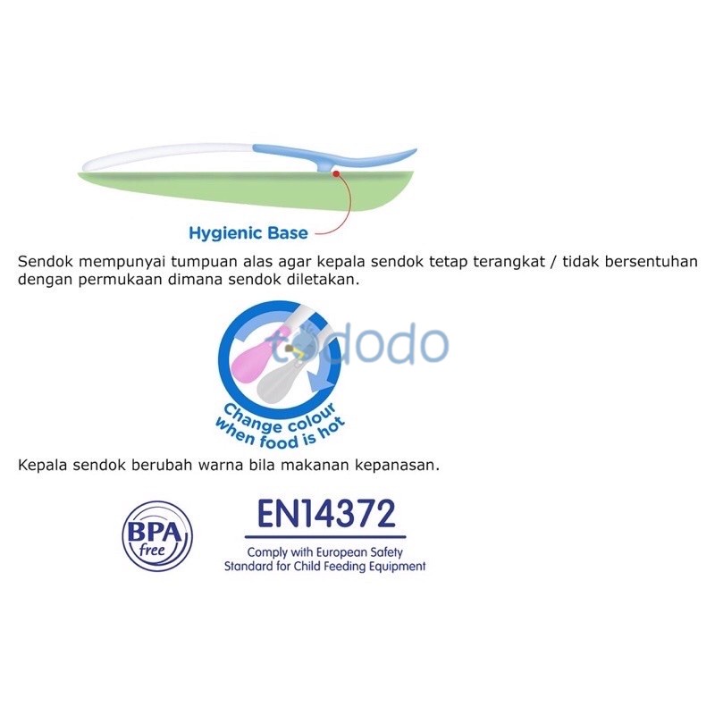 Sendok dapat mendeteksi suhu makanan dan akan berubah warna bila makanan terlalu panas, agar lidah dan mulut bayi tidak terseduh. Ukuran kepala sendok disesuaikan dengan mulut bayi. Sendok mempunyai tumpuan alas agar kepala sendok tetap terangkat / tidak bersentuhan dengan permukaan dimana sendok diletakkan.