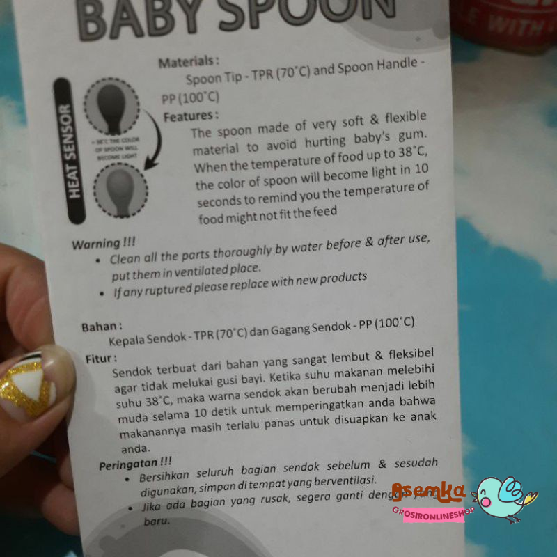 Sendok terbuat dari bahan yang sangat lembut & fleksibel agar tidak melukai gusi bayi. Ketika suhu makanan melebihi suhu 38derajat celcius, maka warna sendok akan berubah menjadi lebih muda selama 10 detik untuk memperingatkan anda bahwa makanannya masih terlalu panas untuk disuapkan ke anak anda.