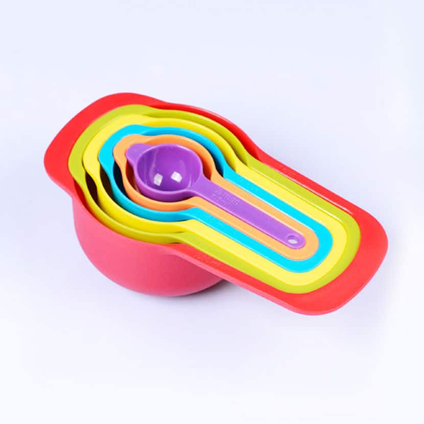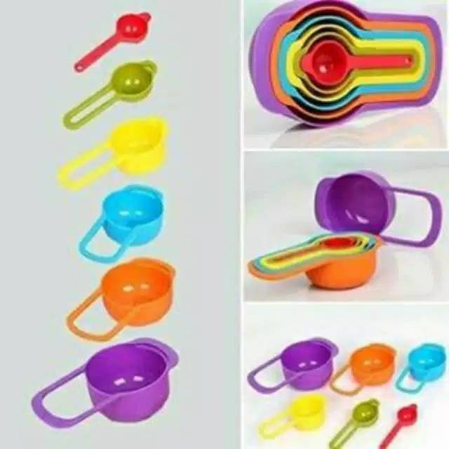 1 set isi 6 pcs Ada takaran ml dan sendok makan (cups) : 1. 7,5 ml = 10 cm 2. 15 ml = 11 cm 3. 60 ml = 12 cm 4. 85 ml = 13,5 cm 5. 125 ml = 14,5 cm 6. 250 ml = 17 cm Multiwarna