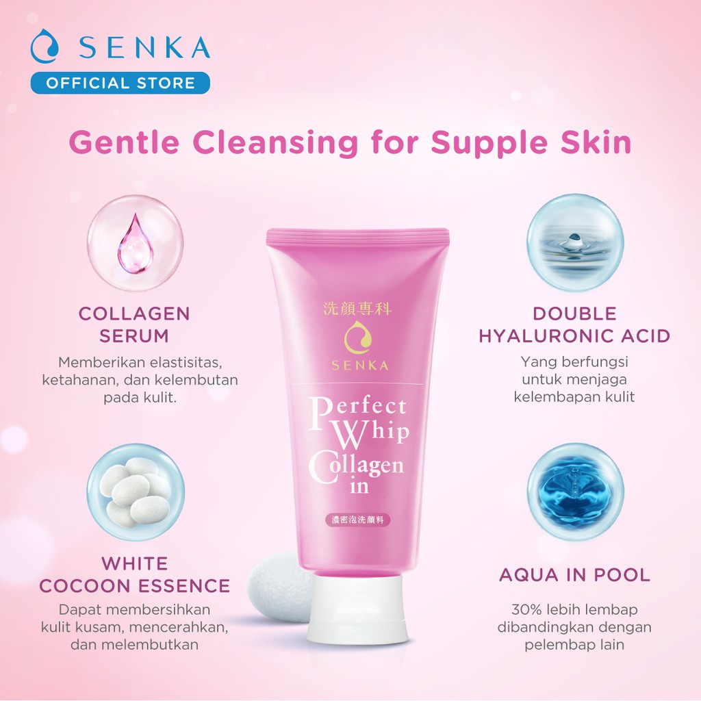 Senka Perfect Whip Collagen In merupakan pembersih wajah yang mengandung 90% Beauty Serum dan Collagen yang dapat meningkatkan elastisitas kulit dan memberikan kulit lebih kenyal dan awet muka. Bahan Aqua-In-Pool melindungi dan memperkuat kulit terhadap kerusakan sehari-hari untuk memperkuat fungsi penghalang kulit. Silk Cocoon Essence khas Senka mengunci kelembapan dan ketahanan untuk kulit lembab yang tahan lama.