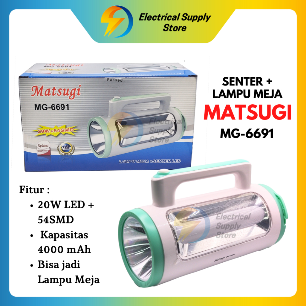 Detail spesifikasi : - Tipe : MG-6691 - Daya : 20W + 54 SMD - Sumber Cahaya : LED - Light Emitting Diode + SMD - Kontrol Cahaya : 3 Mode (Lampu Meja 1 Sisi | Lampu Meja 2 Sisi | Lampu Senter) - Durasi Pemakaian : Mode 1 : 4 jam | Mode 2 : 2-3 Jam | Mode 3 : 6 Jam - Kapasitas Baterai : Kapasitas 2500 mAh - Diameter Lensa : 10 cm - Umur Baterai : > 500 x pengisian - Pengisian Baterai : +/- 12 Jam