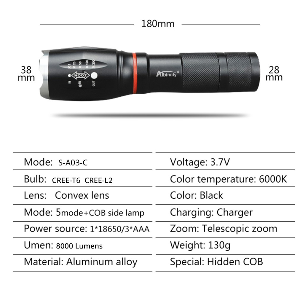 Senter LED ini hadir dengan 2 jenis LED yaitu Cree XM-L T6 pada bagian depan dan LED COB pada bagian samping yang berfungsi seperti lampu lantera atau torch light. Dapat ditempel pada permukaan besi karena tail cap senter ini memiliki bahan magnet yang kuat.