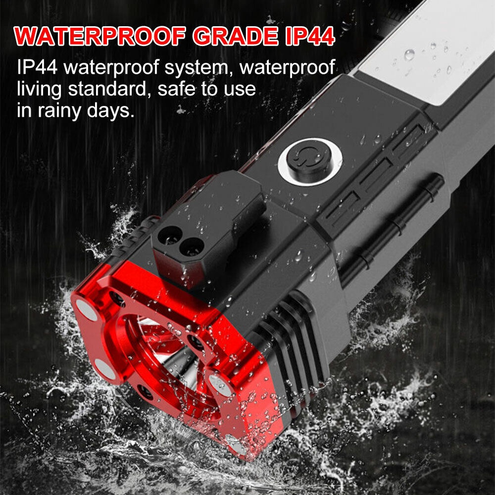 Features: 1. The left side of the flashlight is equipped with a high-hardness tungsten steel safety hammer, and the right side of the head is equipped with a knife. it can be used to escape in an emergency 2. IP44 waterproof system, waterproof living standard, safe to use even in the rain 3. The flashlight has USB output function, which can charge electronic devices when going out 4. The tail is equipped with a strong magnetic magnet, which can absorb iron products for lighting