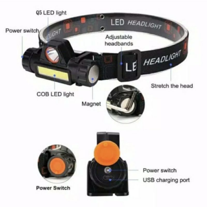 Senter Kepala Led Cree dan Lampu COB. Super Terang. Sistem Cas. Lampu COB Bisa dijadikan lampu penerangan / Emergency. Terdapat Magnit pada Body Senter. dilengkapi Kabel Colok Micro USB. Tali Strap yang Berkualitas. Tombol ON/OFF disamping dan di Buka Penutupnya untuk pengecasan. Cocok untuk Bersepeda, Memancing, Camping, Hiking, Berlayar. dll