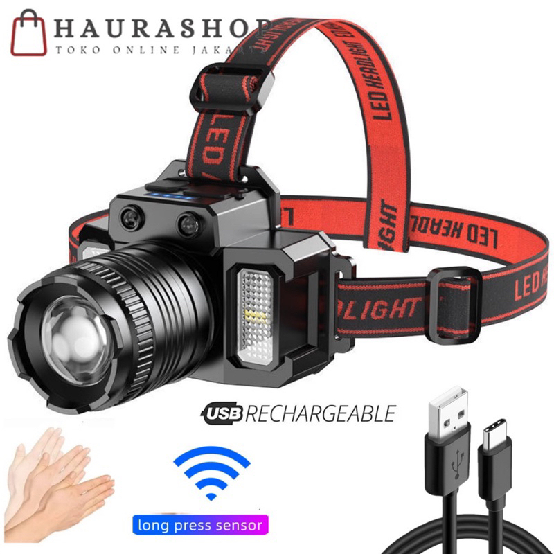 Senter Kepala 5 mode multi-fungsi. dilengkapi fungsi sensor, lampu sorot dengan jangkauan 500 meter, dan kecerahan 4000 lumens, awet, kuat dan tahan lama.