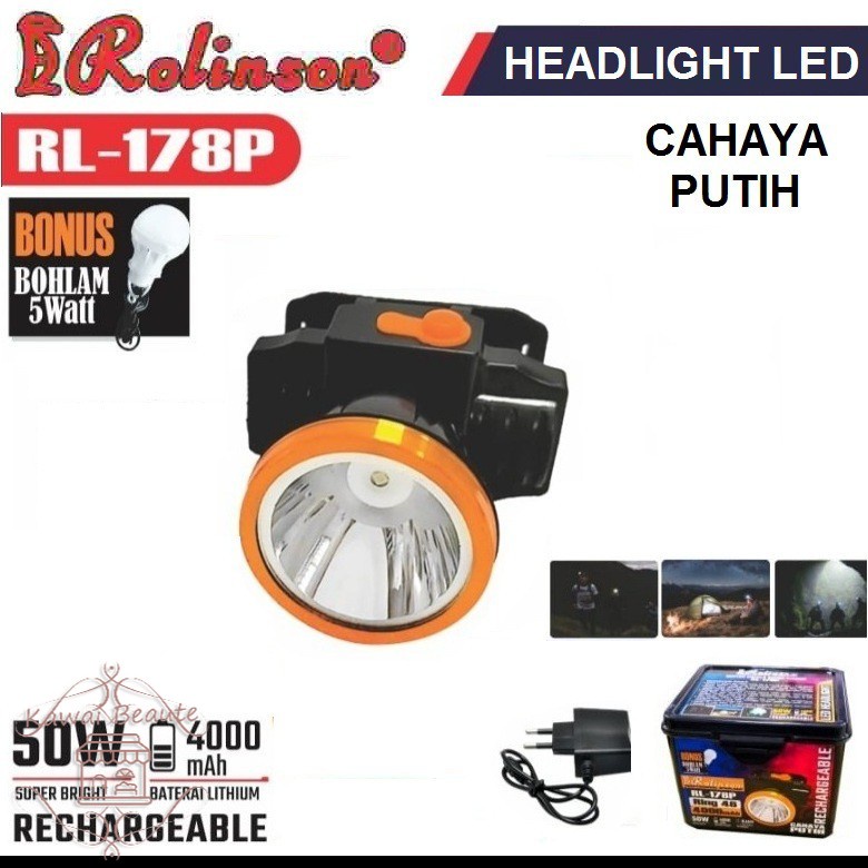 Senter Kepala Rolinson RL-178P . Cahaya putih . 2 Mode Pencahayaan Terang dan Sedang . Ring Kepala Senter 46 = 5 cm . Rechargeable . Daya Tahan Pemakaian 8 jam . Super Bright 50 WATT . Baterai : 4000mAh . BONUS bohlam LED 5 watt