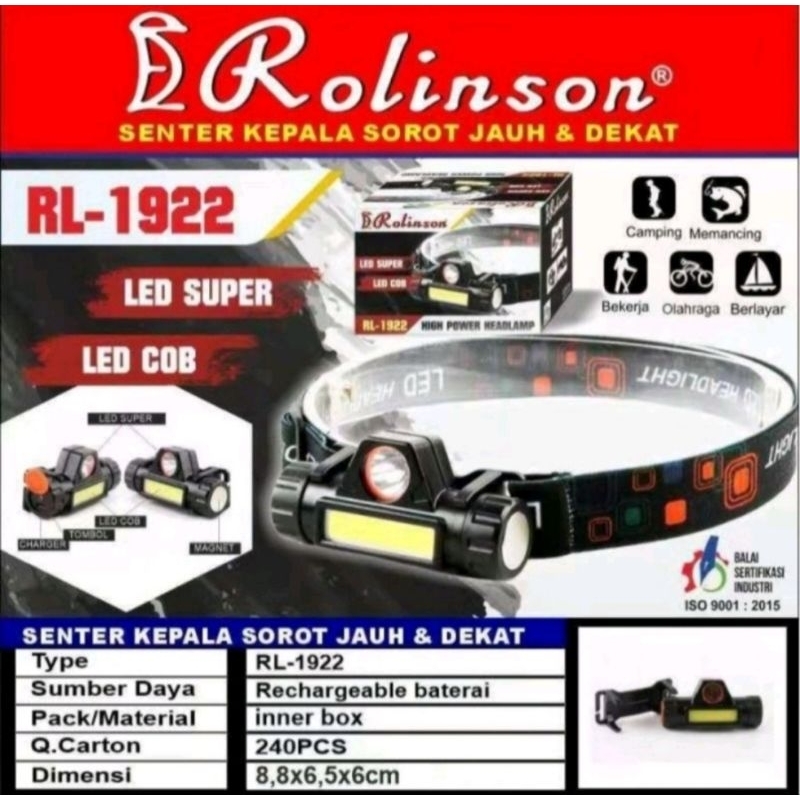 SENTER KEPALA ROLINSON RL1922 Senter Kepala RL-1922 Led Cob Rechargeable / Headlamp Sorot Senter Kepala Led Cree dan Lampu COB. Super Terang. Sistem Cas. Lampu COB Bisa dijadikan lampu penerangan / Emergency. Terdapat Magnit pada Body Senter. dilengkapi Kabel Colok Micro USB. Tali Strap yang Berkualitas. Tombol ON/OFF disamping dan di Buka Penutupnya untuk pengecasan. Cocok untuk Bersepeda, Memancing, Camping, Hiking, Berlayar. dll
