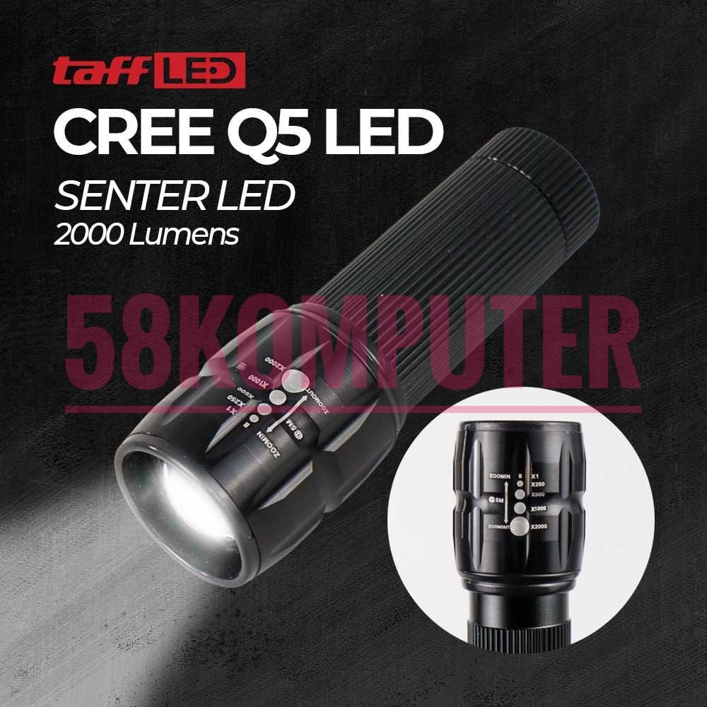 SPESIFIKASI TAFFLED SENTER LED FLASHLIGHT CREE Q5 2000 LUMENS - LFU01 Kelengkapan Produk : 1 x TaffLED Senter LED Flashlight Cree Q5 2000 Lumens - LFU01 1 x Lanyard Spesifikasi : Tipe LED :Cree Q5 Lumens :2000 Lumens Jarak Penerangan :100 Meter Tipe Baterai :3 x AAA Material :Aluminium Steel Dimensi Panjang: 9.8 cm Diameter Atas: 3 cm Diameter Bawah: 2.5 cm