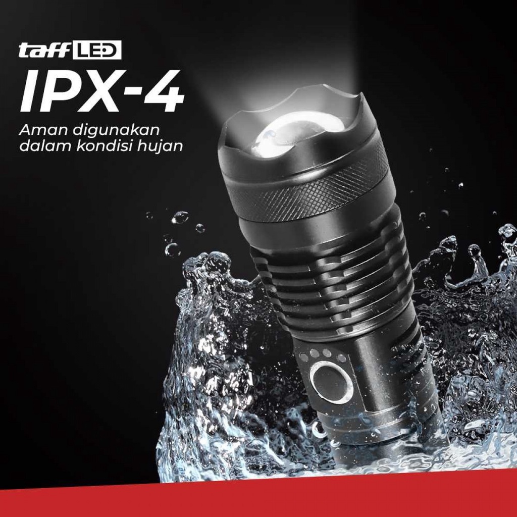 Desain Tahan Air Tidak hanya lampu yang terang, senter juga memberikan fitur waterproof untuk senter ini membuatnya aman digunakan dalam kondisi basah sekalipun.