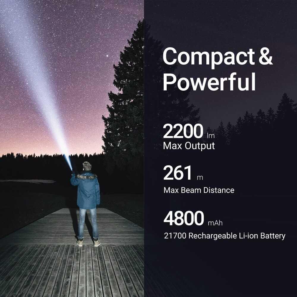 Durasi Hidup Sampai 120 Jam Ditenagai dengan satu buah baterai 21700 dengan kapasitas 4800 mAh, yang dapat digunakan hingga 120 jam. Senter ini begitu irit memakan daya karena menggunakan lampu LED, sangat cocok digunakan untuk petualangan di luar ruangan seperti mendaki gunung dan semacamnya.