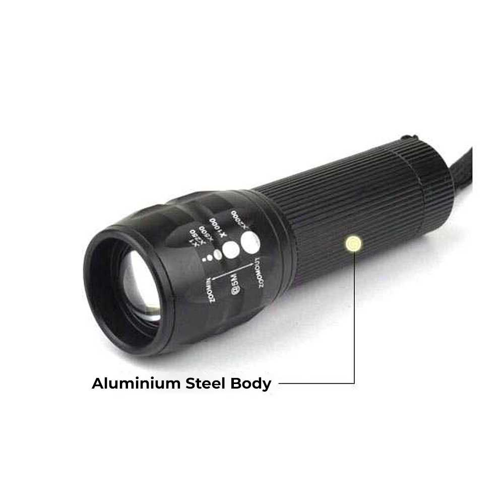 Bahan Aluminium Steel Body dari senter LED ini terbuat dari aluminium steel, mencegah goresan yang mungkin terjadi pada badan senter. Membuat tampilan senter lebih keren dengan desain body anti slip yang membuat senter nyaman untuk digenggam.