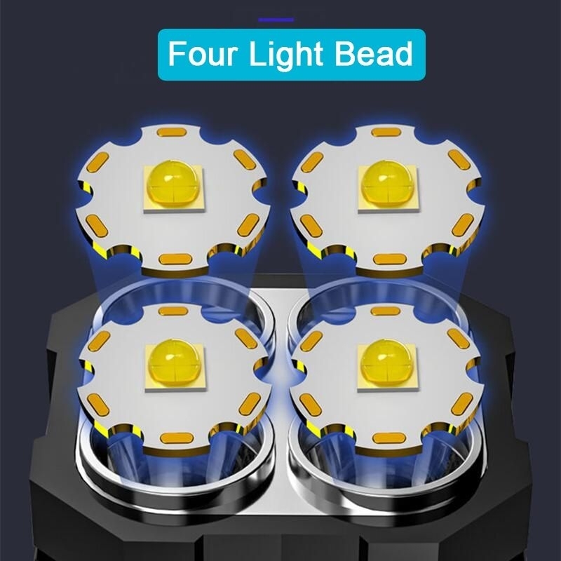 Senter LED yang super terang dengan 4 Mode : full terang, redup, kelap kelip ( strobo ) Dan Lampu Emergency