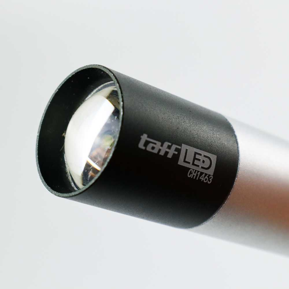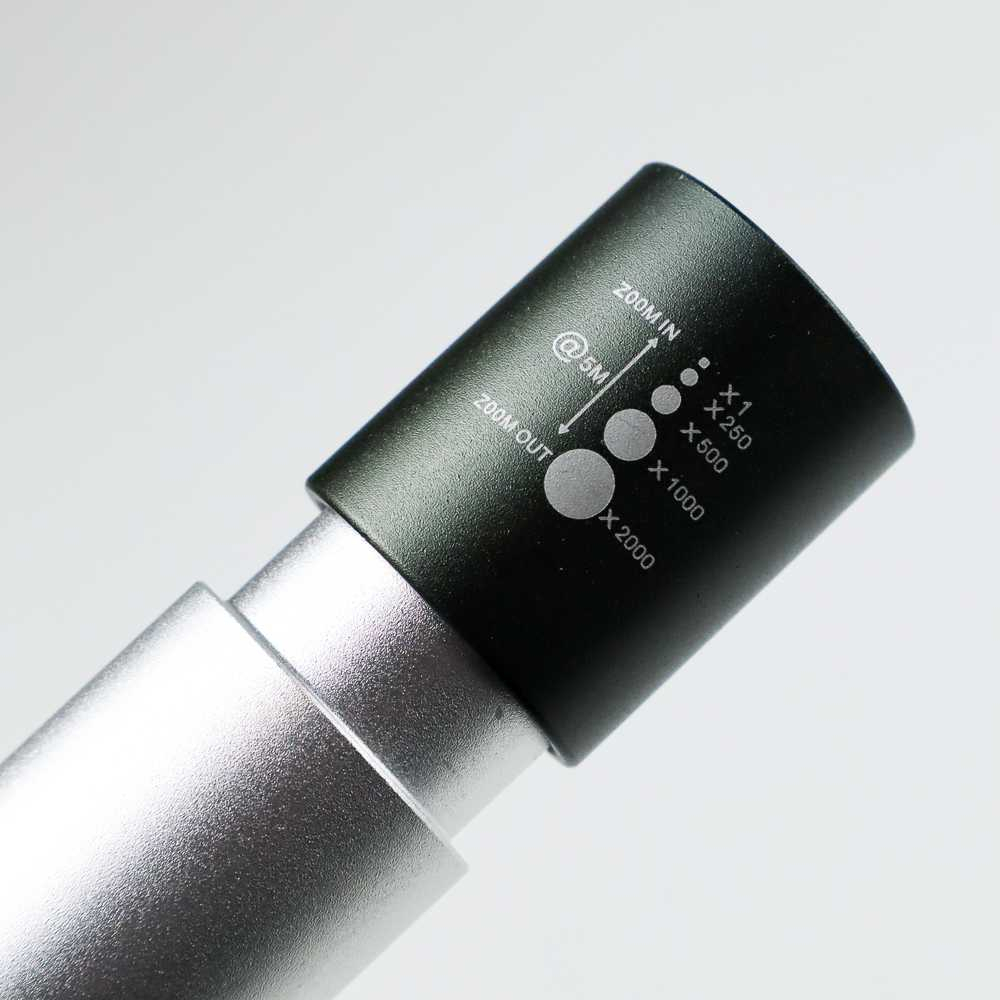 Bisa Di Zoom Bagian kepala senter juga dapat di atur titik zoom focusnya sehingga dapat memilih antara cahaya yang melebar atau cahaya yang terfokus ke satu titik.