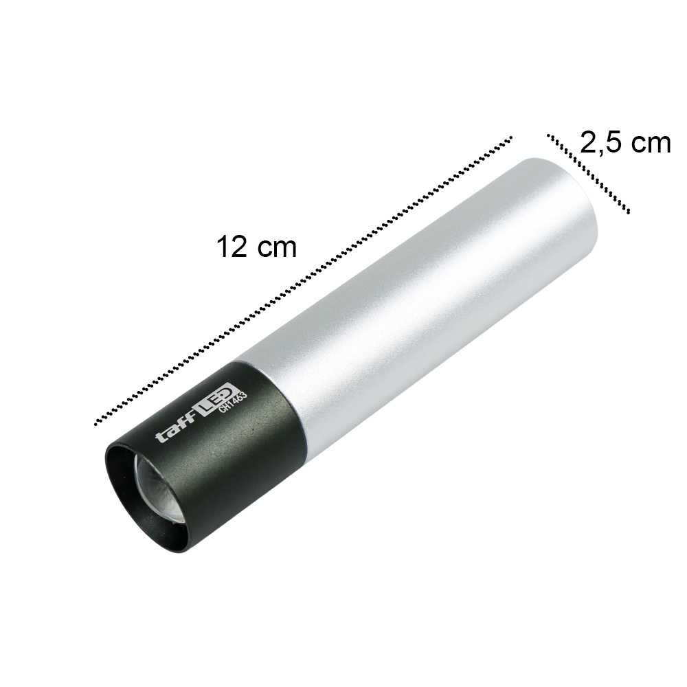 Spesifikasi TaffLED Senter LED Mini USB Rechargeable Cree XM-L T6 1200mAh - CH1463 • Tipe LED: Cree XM-L T6 • Voltase Input: 5 V Micro USB • Output: 4.2 V USB • Kapasitas Baterai: 1200 mAh • Durasi Isi Daya Baterai: Sekitar 3-4 Jam • Durasi Hidup Senter: Hingga 3 Jam • Material: Aluminium T6063-T6 • Dimensi: 2.5 x 2.5 x 12 cm