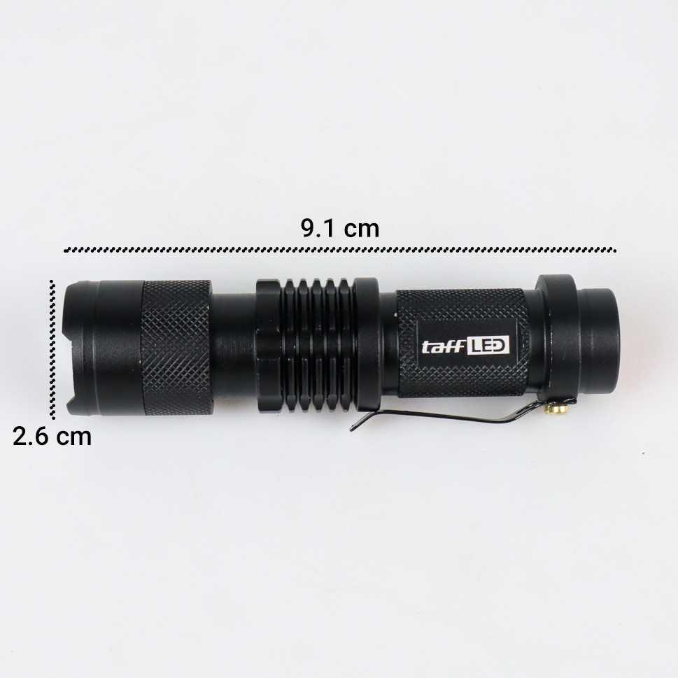 Spesifikasi TaffLED Senter LED 395nm Waterproof Pocketman Ultraviolet - P1 Tipe LED : Q5 LED Lumens : 600 Lumens Tipe Baterai : 1 x AA / 1 x 14500 (Baterai tidak termasuk) Material : Aluminium Dimensi : 9.1 x 2.6 x 2.6 cm