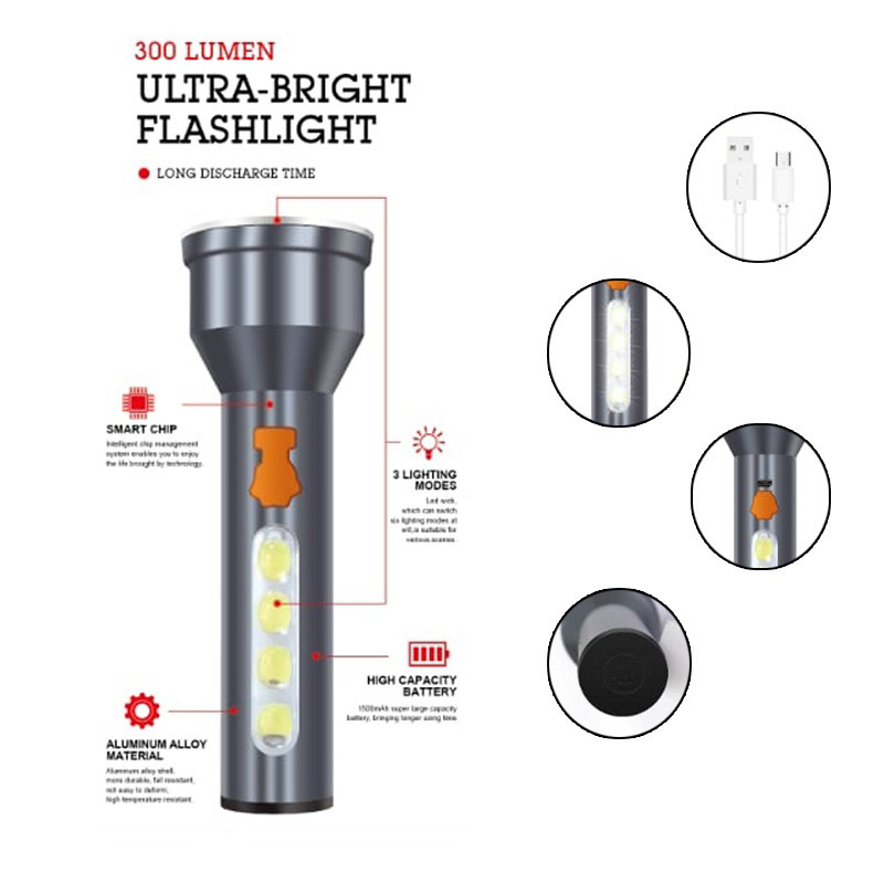 Detail SENTER LED SUPER TERANG DAN JARAK JAUH + COB 3 MODE / ULTRA-BRIGHT FLASHLIGHT RECHARGEABLE JRW0154