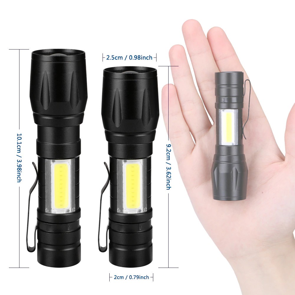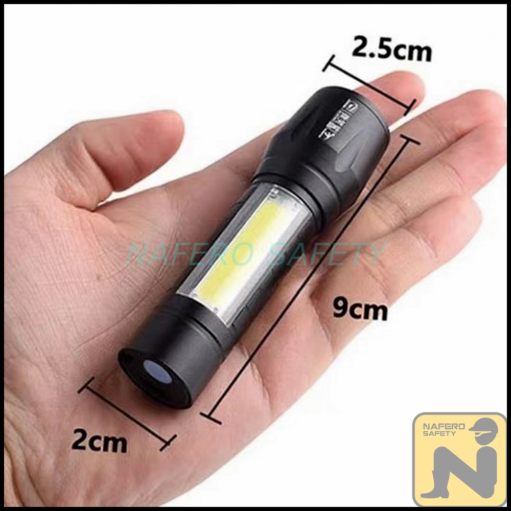 Tipe LED ;COB LED + Q5 Lumens ;2300 Lumens Tipe Baterai ;1 x 14500 (termasuk) Kapasitas Baterai ;1200 mAh Durasi Isi Daya Baterai: Sekitar 2 Jam Durasi Hidup Senter: Hingga 2-4 Jam Material ;Aluminium Dimensi ;25 x 25 x 91 mm