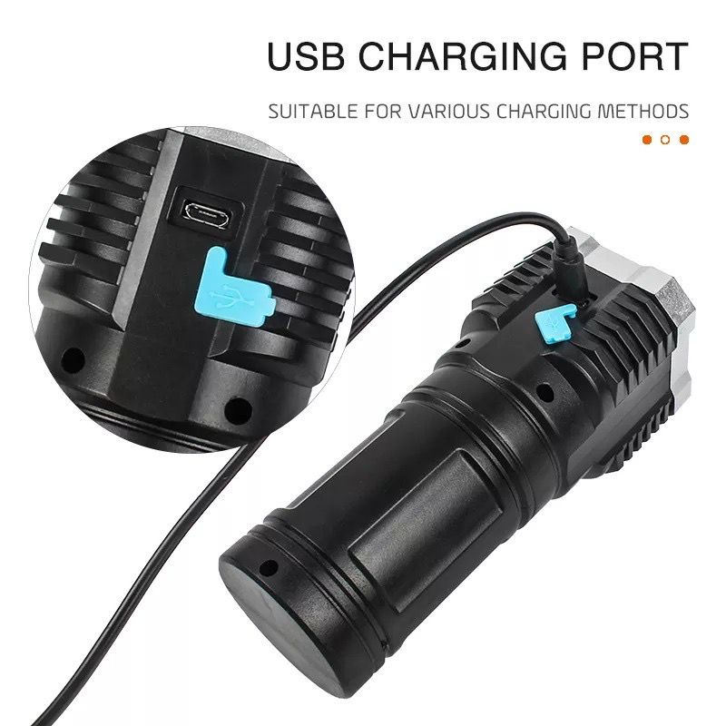 Senter dengan 4 mata LED dan lampu COB (pada bagian samping) memiliki cahaya super terang dan dapat diisi ulang (rechargeable) dengan lampu indikator status baterai 4 tahap untuk mengingatkan pengisian daya tepat waktu. Tersedia 4 mode pencahayaan, Nyala Terang, Nyala Redup, Mode SOS, Nyala Samping. Terbuat dari bahan berkualitas, senter ini terjamin kokoh dan tidak ringkih. Senter portable dan ringan sangat ideal untuk penggunaan di dalam maupun di luar ruangan seperti berkemah, hiking, memancing ataupun dalam keadaan darurat.