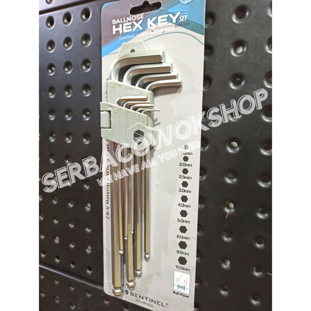 * Merk : Sentinel * Kunci L Ballpoint Extra Long finishing Chrome berkualitas bagus dan tahan lama * Isi : 9 pcs Tipe lubang * UKURAN : 1.5-10mm Pentol