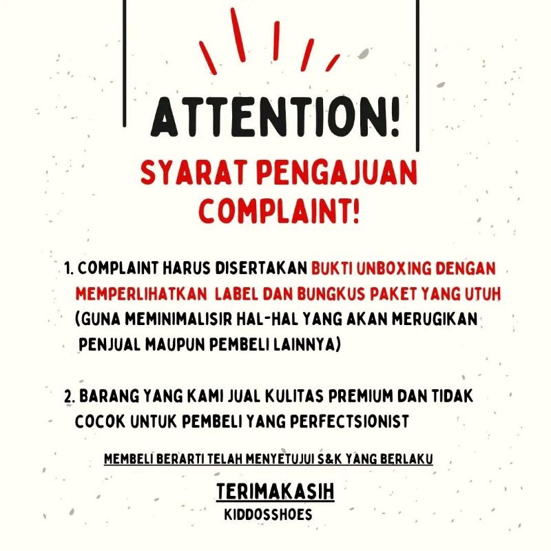 1. Pastikan sudah mengukur panjang telapak kaki anak berapa cm (bisa menggunakan penggaris/meteran pakaian atau lainnya) untuk menyesuaikan panjang insole sepatu (Insole = sol dalam sepatu). Usia anak tidak bisa jadi patokan ukuran sepatu dan setiap merk sepatu beda insole. 2. Kami usahakan untuk mengukur insole manual karena ukuran insole yang tertera pada size sepatu terkadang kurang valid. 3. Jika size sepatu yang dikirim tidak sesuai, kebesaran atau kekecilan bisa retur atau menghubungi langsung ke penjual. 4. Retur bisa diajukan melalu chat ke Penjual terlebih dahulu.