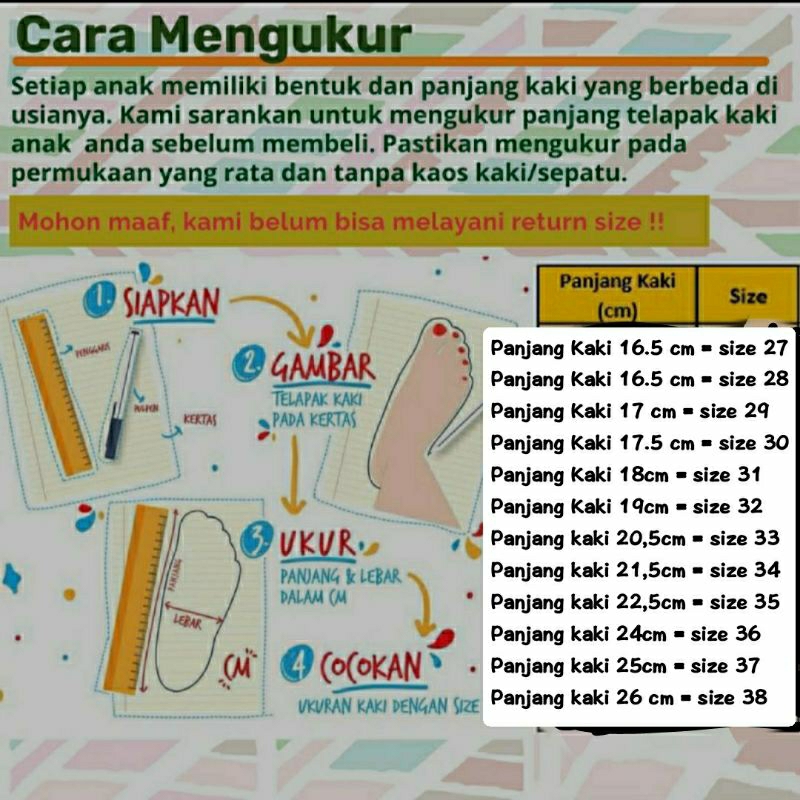 Size berdasarkan panjang kaki. Panjang Kaki 16.5 cm = size 27 Panjang Kaki 16.5 cm = size 28 Panjang Kaki 17 cm = size 29 Panjang Kaki 17.5 cm = size 30 Panjang Kaki 18cm = size 31 Panjang Kaki 19cm = size 32 Panjang kaki 19,5cm = size 33 Panjang kaki 20 cm = size 34 Panjang kaki 20,5cm = size 35 Panjang kaki 21 cm = size 36 Panjang kaki 21,5cm = size 37 Panjang kaki 22 cm = size 38