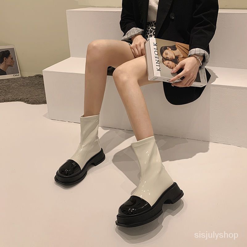 Detail Sepatu bot pendek wanita 2022 warna-warni baru hitam dan putih Martin boots tebal bawah meningkatkan