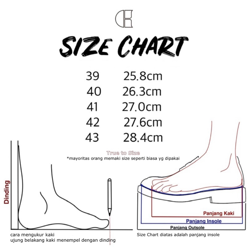sizechart 39 : 25.8cm 40 : 26.3cm 41 : 27.0cm 42 : 27.6cm 43 : 28.4cm panjang diatas adalah panjang insole, bukan panjang outsole, atau panjang kaki jika panjang kaki 25cm, maka ambil size 39 (25.8cm), sehingga memberikan ruang 0.8cm di ujung depan sepatu lebih jelasnya lihat gambar di foto produk