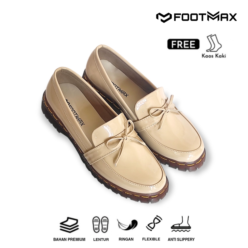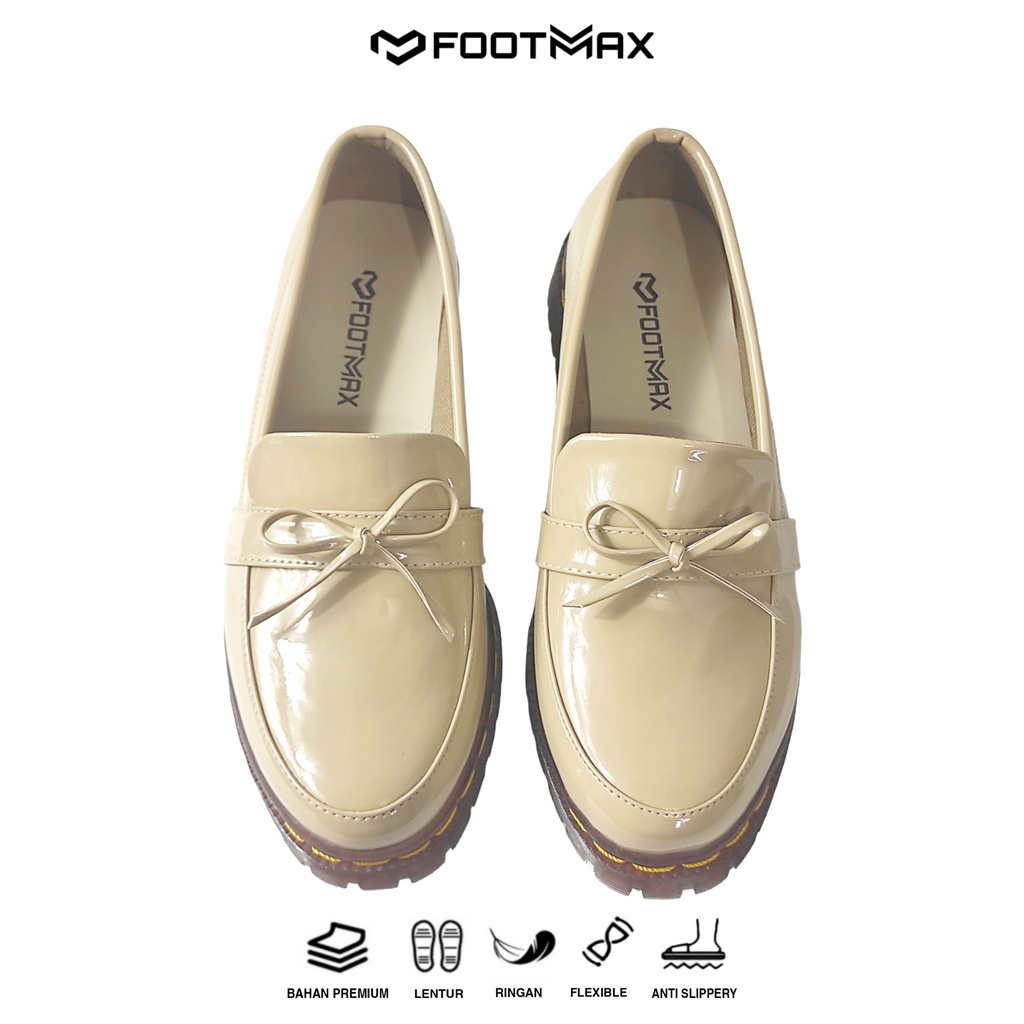 Merk FOOTMAX Upper Syntetis Lux Kilap Accesoris Hiasan Tali Vita Linning / Lapis Dalam Cream Double Mesh Pola Jahitan Cream Insole Spons Polyfoam Syntetis Embos FOOTMAX Outsole Docmart Karet Pvc Anti Licin Sudah Di Jahit Keliling Size 36,37,38,39,40 Ada 2 VarianWarna Cream Kilap & Hitam Kilap / Realpicture